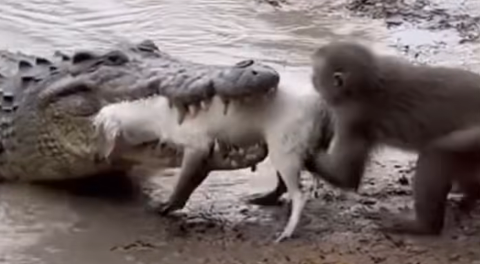 High above, perched on a nearby tree, a clever monkey witnessed the terrifying scene. Without a second thought, the monkey leapt from branch to branch, then plunged fearlessly into the water. Fighting against the strong currents and the crocodile’s fierce grip, the monkey struggled with every ounce of strength.