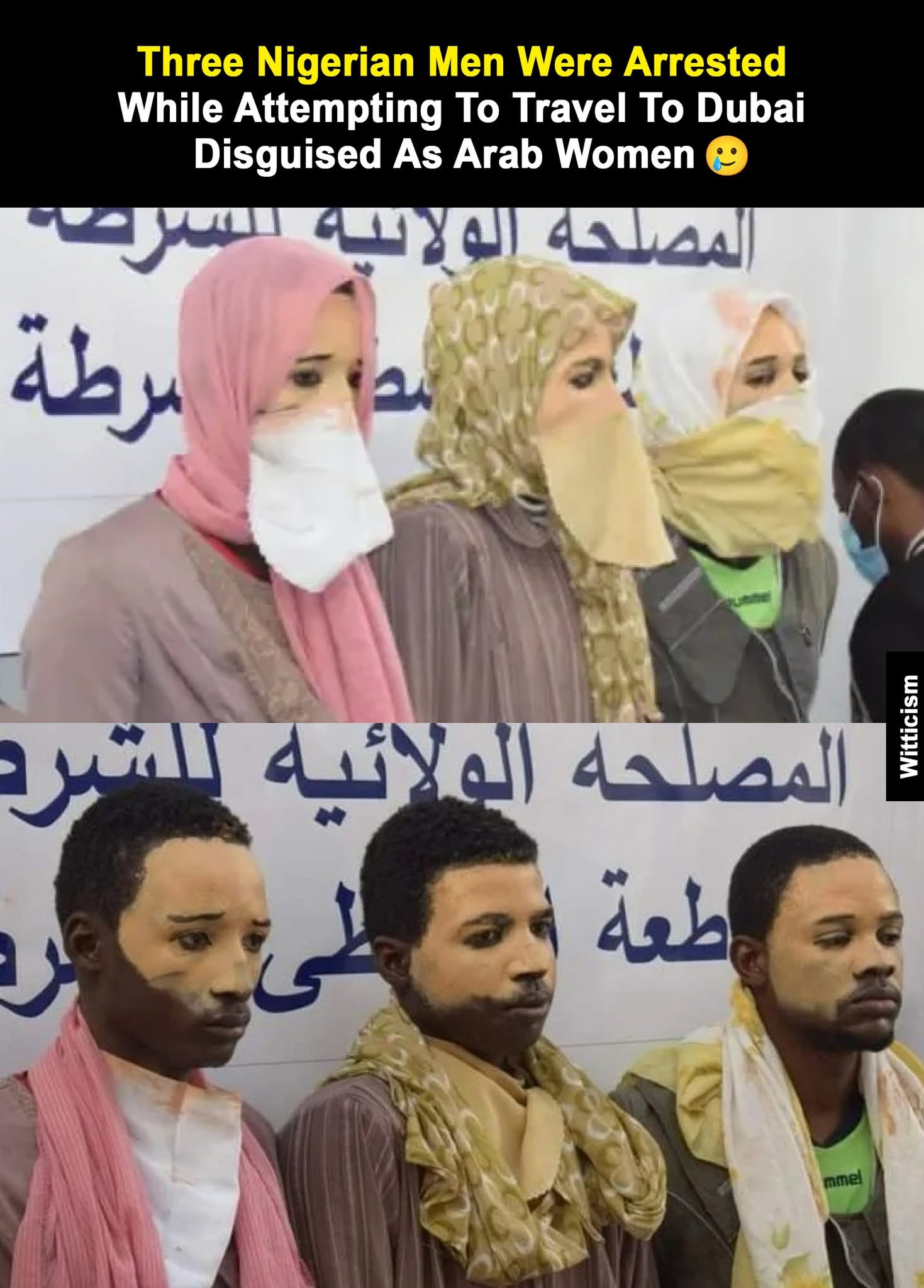 The pictures show their dramatic “transformation” — from covered “ladies” to very confused men once unmasked. Although many posts online claim that they were Nigerians trying to travel to Dubai, this story hasn’t been confirmed by any official sources, so it’s best taken as one of those funny internet moments that turned into a meme.