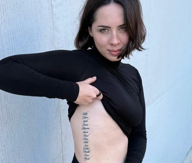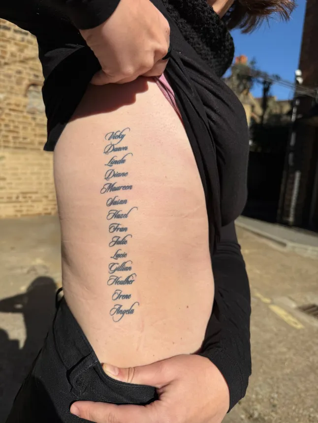 Once the list was complete, she went to Walker’s studio with photographer Emily Lomas, who documented the process. The tattoo stayed private for six months before she decided to post it. ‘I was a bit hesitant,’ she says. ‘But somewhere along the way, I thought no, I’m really proud of it.’