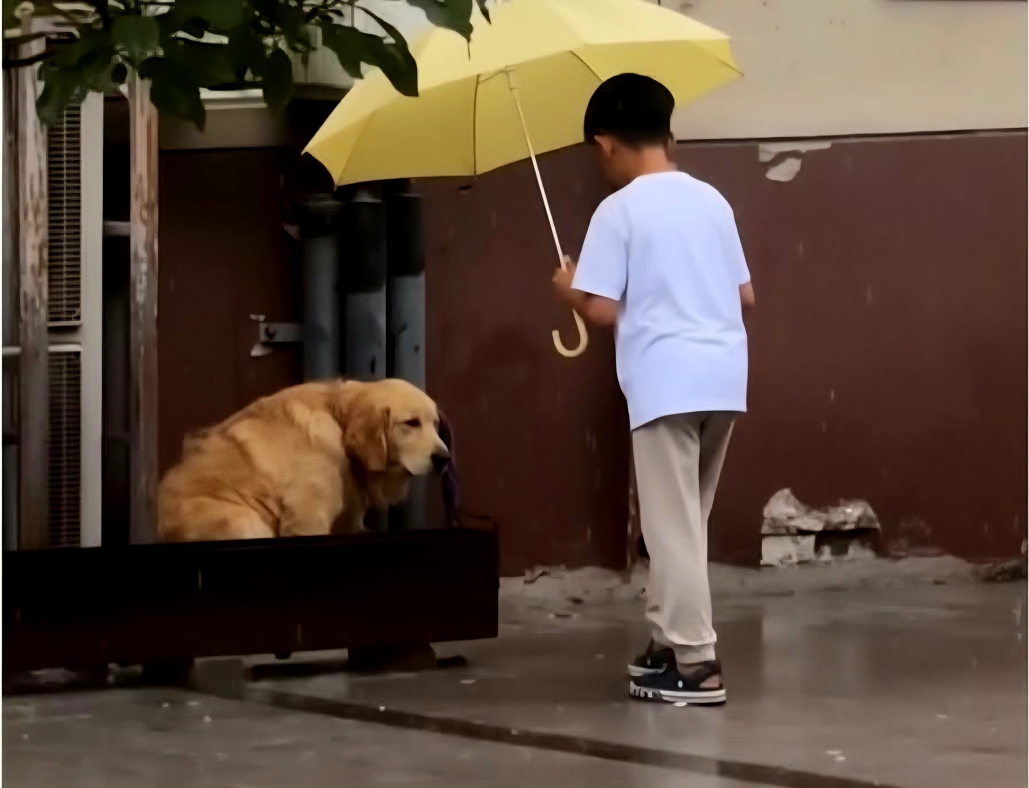 People passed by, hurrying under umbrellas, not noticing the dog. But one little boy stopped. He stood there for a moment, staring at the dog, its fur heavy with rain, its tail still wagging weakly at the sight of kindness.