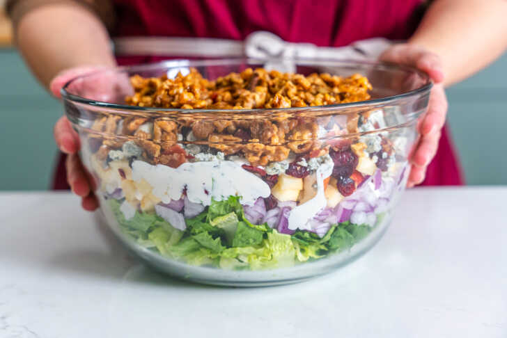If you’re making this the day before, stop layering after you’ve added the dressing and cheese. Cover the bowl with plastic wrap and chill it until you’re ready to serve it. Two days is kind of your limit for chilling. Once you’re ready to present it, add the gorgonzola, bacon, and nuts, and right before serving, toss everything together.