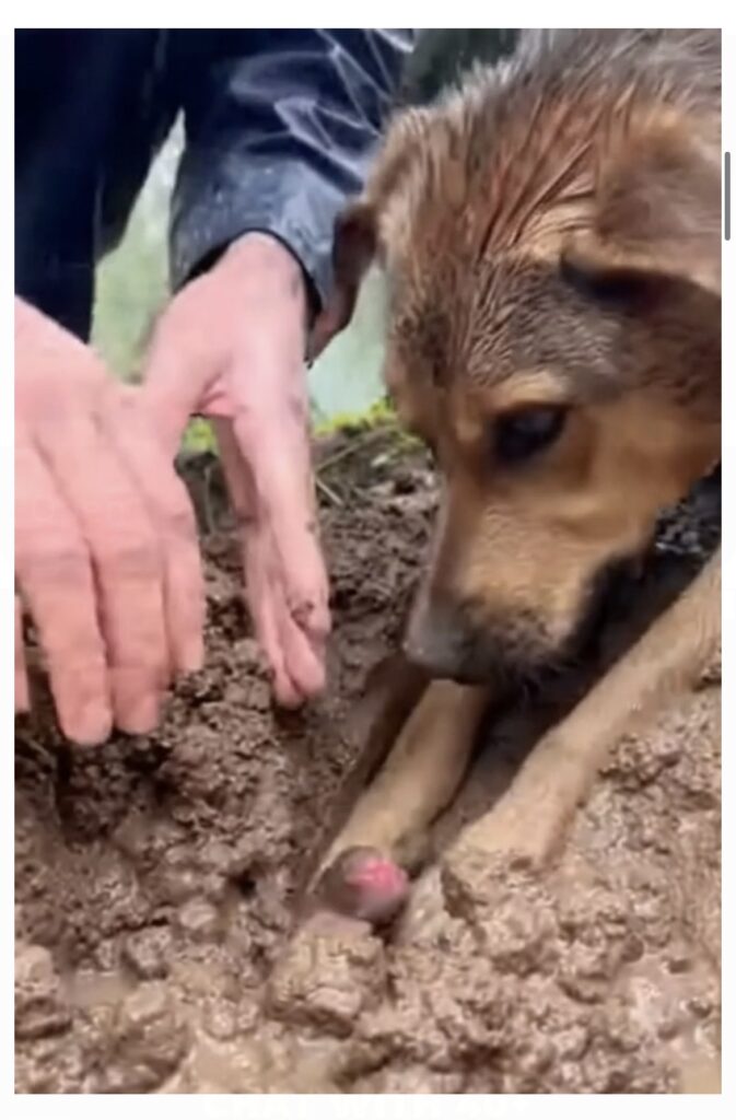 Everything changed in an instant. They dug faster now, hands trembling, the mud packed tightly around something small and still. The puppy had been buried deep-far too deep. When they uncovered his face, it was gray and cold. Lifeless. Someone whispered “no.” And the mother pushed forward. She licked his face, once, twice, again and again. She nudged him with her nose. Let out a soft, broken whine.