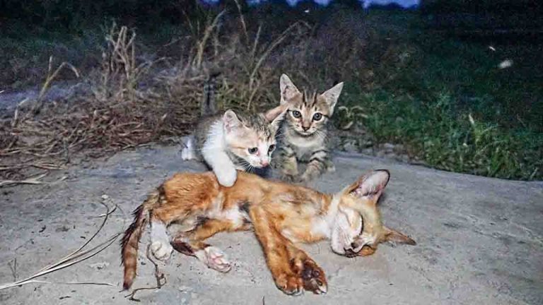 Few sounds are as piercing as the desperate cries of hungry kittens searching for their mother. Those fragile, trembling voices were what first drew a rescuer’s attention, echoing through an unforgiving environment where survival was never guaranteed. The tiny kittens were huddled together, calling out again and again, their small bodies shaking with fear and exhaustion. They did not understand the danger they were in; they only knew they needed their mother. Following the sound of their cries, the rescuer made a heartbreaking discovery nearby—a mother cat lying motionless, her body so thin and depleted that it seemed almost impossible she was still breathing.